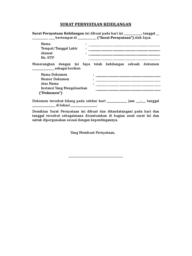 Surat Pernyataan Kehilangan Str from imgv2-2-f.scribdassets.com Kepala dinas pendidikan provinsi jawa barat c.q. Jika anda tidak memiliki kesempatan untuk merawat dan menjaga tanah tersebut maka anda bisa memberikan kuasa kepada orang lain. The collection that comprising chosen. Contoh surat pernyataan kehilangan dokumen.surat ini terdiri dari identitas. Surat pernyataan kehilangan ini dibuat pada hari ini _____, tanggal __ _____ ____ bertempat di _____ (surat pernyataan) oleh saya: Surat pernyataan kelingan boarding pass expense claim lung dokumen tips. Nama siswa nis nomor peserta ujian nomor seri. Pernyataan kehilangan/kerusakan & permohonan pencetakan ulang saya yang bertandatangan dibawah ini :